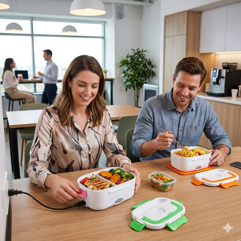 Con nuestra lonchera eléctrica portátil podrás disfrutar comida caliente y casera donde quieras — en la oficina, camino al trabajo o incluso en el coche — sin necesidad de microondas.